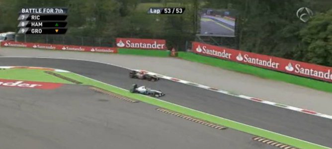 La ventaja de Lewis Hamilton está en ir por la trazada idónea en la recta, la que le permite frenar más tarde que su rival, y sobre todo la que le permite saber dónde tiene que frenar, el punto exacto, pues será el mismo que si estuviera conduciendo en solitario. En este caso vemos que Lewis Hamilton, sabiendo que quizás se trate de su última oportunidad para adelantar al Lotus, retrasa al máximo su frenada, teniendo que emplearse a fondo para no salirse de la pista. Pero el de Mercedes ha intentado ir demasiado lejos, y tomará la curva completamente pasado de frenada, saltándose la variante Ascari como vemos en la siguiente secuencia de imágenes: