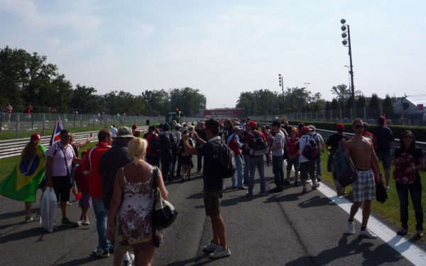 A pesar de que tenía asiento reservado y que no necesitaba llegar muy pronto al circuito, quise estar allí desde primera hora de la mañana y disfrutar de cada detalle, de cada imagen que se pudiese producir en un día tan especial para miles de 'tifosi'. En primer lugar decidí comprobar los ánimos con los que pilotos y equipos acudían a la 14.ª carrera de Fórmula 1, y para ello acudí a la puerta del parking donde los pilotos y miembros de las escuderías aparcan sus coches.
